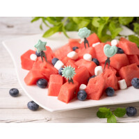 Besonders praktisch für unterwegs, wenn kein Wasserhahn in der Nähe ist, sind die stabilen Edelstahl-Spieße ein echter Gewinn. Auch auf Fingerfood-Buffets zum Kindergeburtstag, bei Weihnachtspartys oder Sommerfesten machen sie eine gute Figur.
