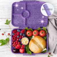 Mit der Glitzer Brotdose von LEKKABOX® startest du nun noch strahlender in den Tag. Denn die auslaufsichere Lunchbox lässt nicht nur Kinderaugen leuchten. Auch große Glitzerfans werden nie wieder eine andere Brotbüchse benutzen wollen. Durch die Unterteilung in 4 unterschiedlich große, untereinander dichte Fächer kannst du verschiedene Lebensmittel getrennt voneinander aufbewahren. Für noch mehr Vielfalt ziehst du einfach zusätzlich den herausnehmbaren Divider als Ass aus dem Ärmel.
