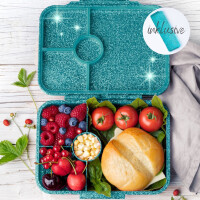 In das große Fach der Glamour Brotbox packst du am besten die Butterbrotstulle, das belegte Brötchen oder einen Wrap für die Schule sowie den Kindergarten. Auch Salat, Nudeln oder Auflauf für das Mittagessen an der Arbeit finden ihren Weg in das größte Fach. Die zwei kleinen Fächer eignen sich super zur Aufbewahrung von Obst, Gemüse, Crackern, Brezeln und anderen Snacks oder Beilagen. In das mini Fach passt etwas kleines Süßes, ein Dip oder ein paar gesunde Heidelbeeren. Einer liebevollen Gestaltung der Bentobox Brotdose für dein Schul- oder Kindergartenkind steht nun nichts mehr im Wege. Die wunderschöne Glitzerbox inspiriert und animiert dich sicher dazu, deinem Kind oder auch dir selbst jeden Tag aufs Neue etwas Leckeres zum Frühstück oder Mittag zu zaubern.